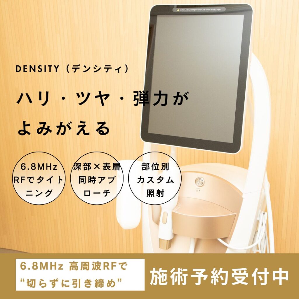 また、リフトアップに効果が期待されるデンシティや、アレキサンドライトロングパルスジェントルレーザー、炭酸ガスCO₂レーザーといった新しい機器も導入し、シミ・しわ・たるみ・毛穴の悩みに合わせた柔軟なケアを提供しています。